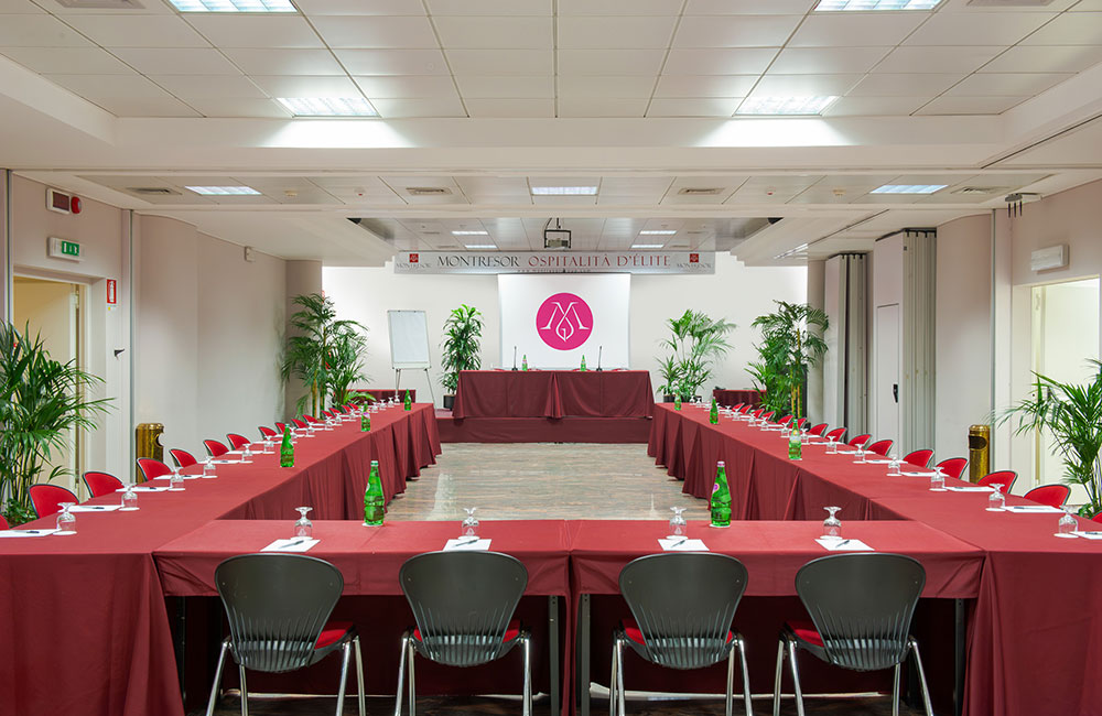 Modular section of approximately 96 m² of the Nabucco room, ideal for meetings of up to 70 people. Flexible layouts: theatre, classroom, horseshoe or single table, perfect for training or seminars. Height 3 m, fully equipped with technology, suitable for all professional needs.